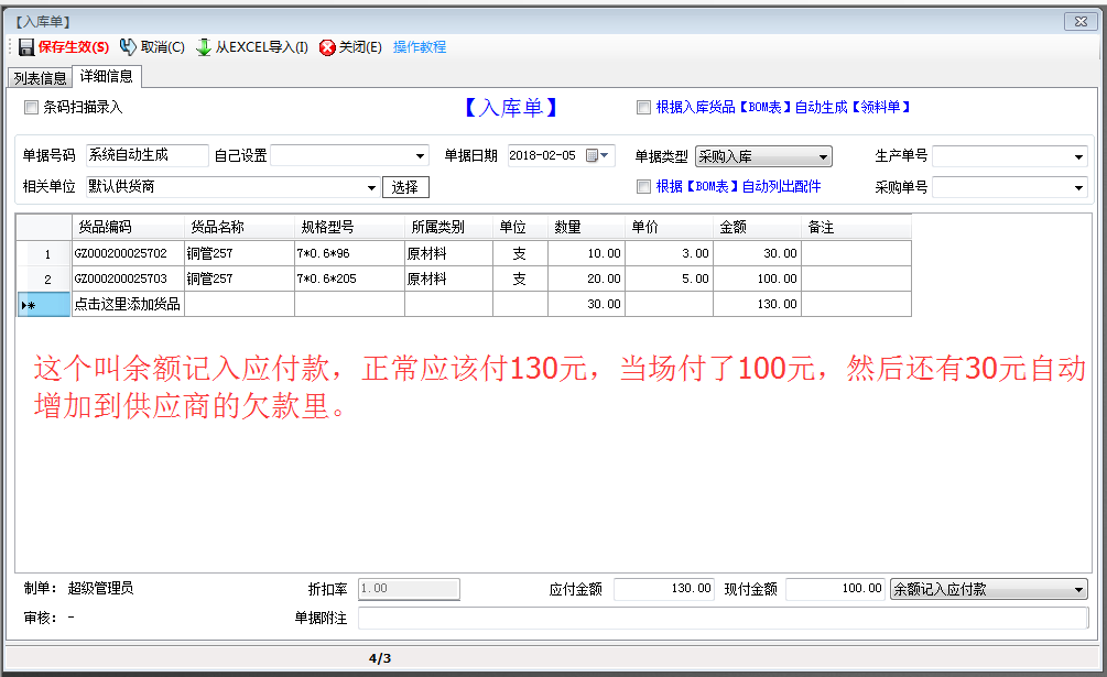 還有一種情況就是,當(dāng)場(chǎng)付了一部份。比如正常應(yīng)該付130元,當(dāng)場(chǎng)只付了100元,還有30元沒付,后面選擇的是余額記入應(yīng)付款。那么系統(tǒng)就會(huì)自動(dòng)增加一筆30款的欠款到這個(gè)供應(yīng)商的欠款記錄里。