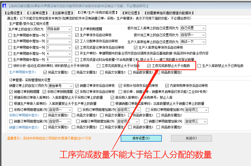 在中間,右邊位置,有一項(xiàng)【工序完成數(shù)禁止大于分配數(shù)】打上勾。(打勾:表示開(kāi)啟限制 不打勾:表示關(guān)閉限制)