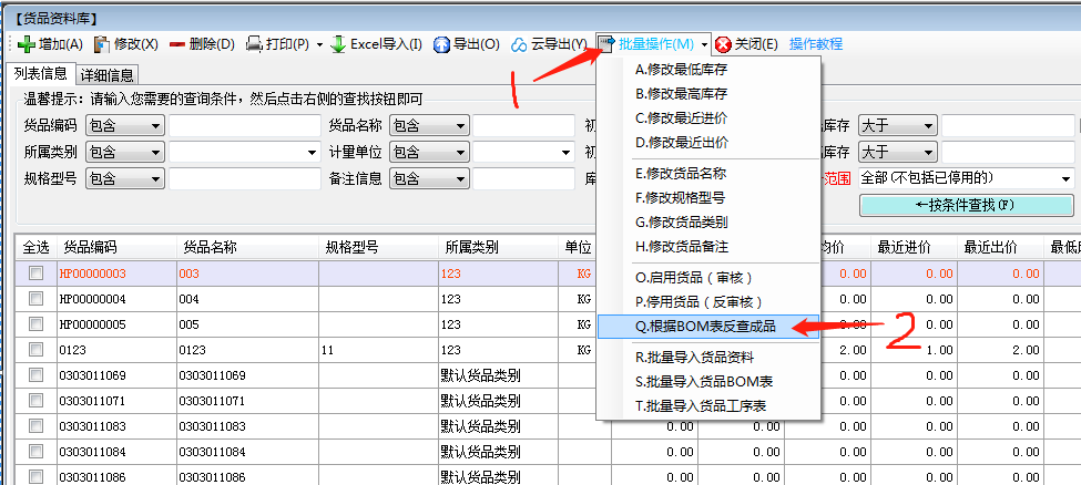 在基礎(chǔ)數(shù)據(jù),貨品管理界面,點批量操作,根據(jù)BOM表反查貨品