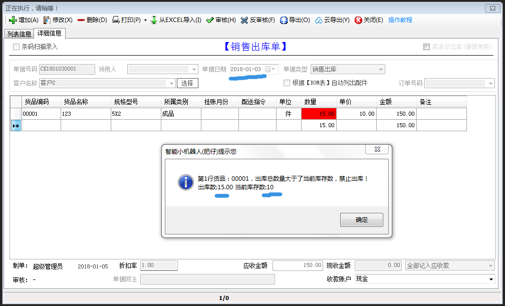 經(jīng)查詢確認(rèn),此貨品在2018.1.3號(hào)的時(shí)候,貨品的庫(kù)存數(shù)量只有10個(gè),后來(lái)是因?yàn)樵?號(hào)當(dāng)天入庫(kù)了20個(gè),所以庫(kù)存才變成30個(gè)的。因此,在2018.1.3號(hào)的時(shí)候,是不能出庫(kù)15個(gè)的。最終確認(rèn),程序并沒有任何問(wèn)題,提示也是正確的。只是大家忽略了一個(gè)單據(jù)日期。